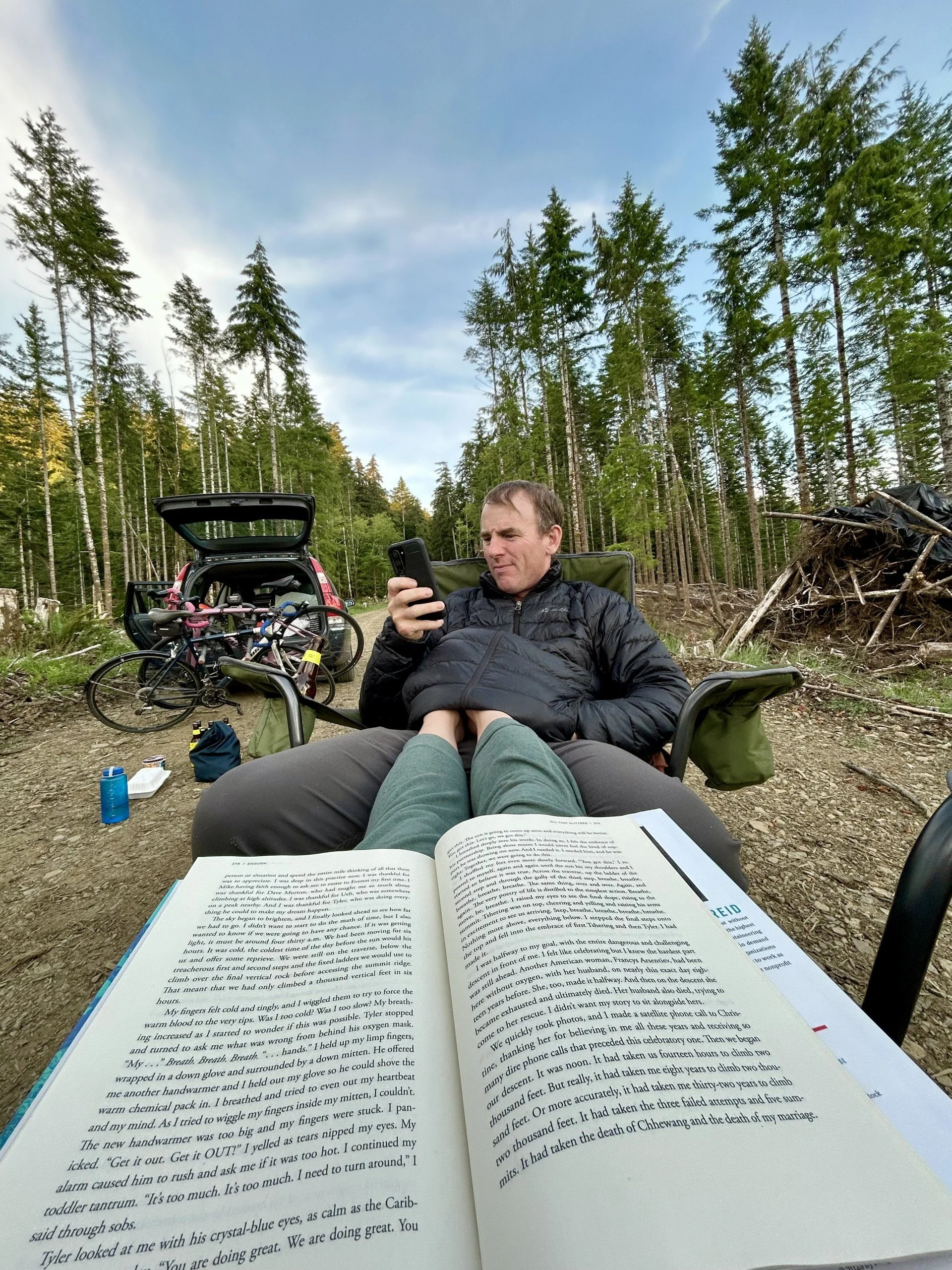 Reading Enough at Andy and I’s campsite (on a logging road lol) on the Oregon coast, July 31st.